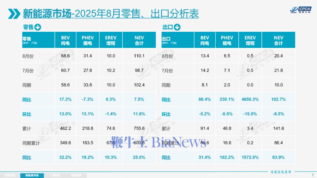9月8日,乘联分会发布2025年8月份全国乘用车市场分析报告。数据显示,新能源市场8月零售110.1万辆,同比增长7.5%,渗透率达55.2%,1-8月累计零售755.6万辆,同比增长25.8%。批发128.2万辆,同比增长22.3%,其中纯电动车型批发81.5万辆,同比增幅达38.5%。